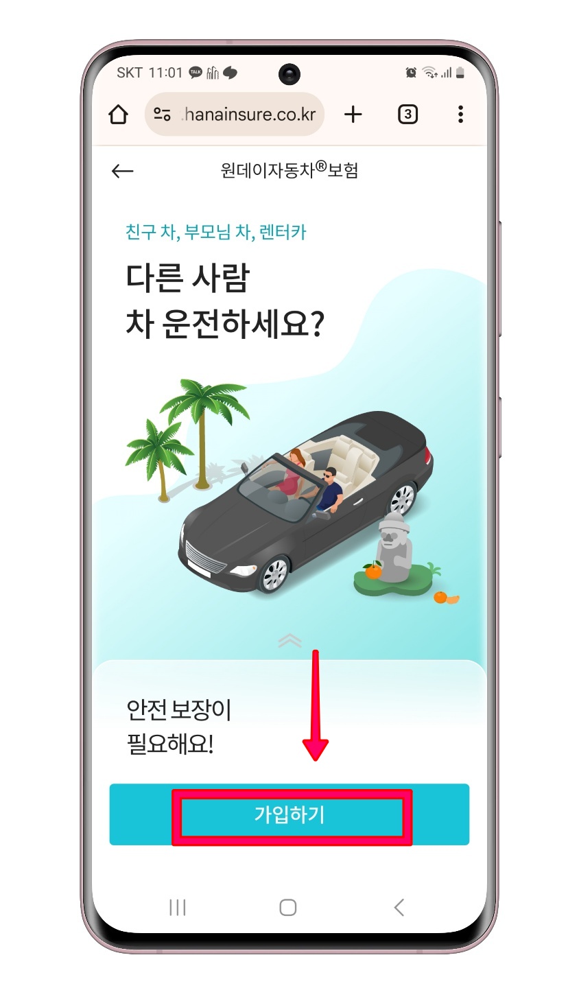STEP 4. 원데이자동차 보험에 가입할 수 있는 창이 뜨게됩니다. 하단 [가입하기]를 통하여 가입을 진행하시면 됩니다. _ 하나손해보험으로 연결되어 가입이 진행됩니다.
