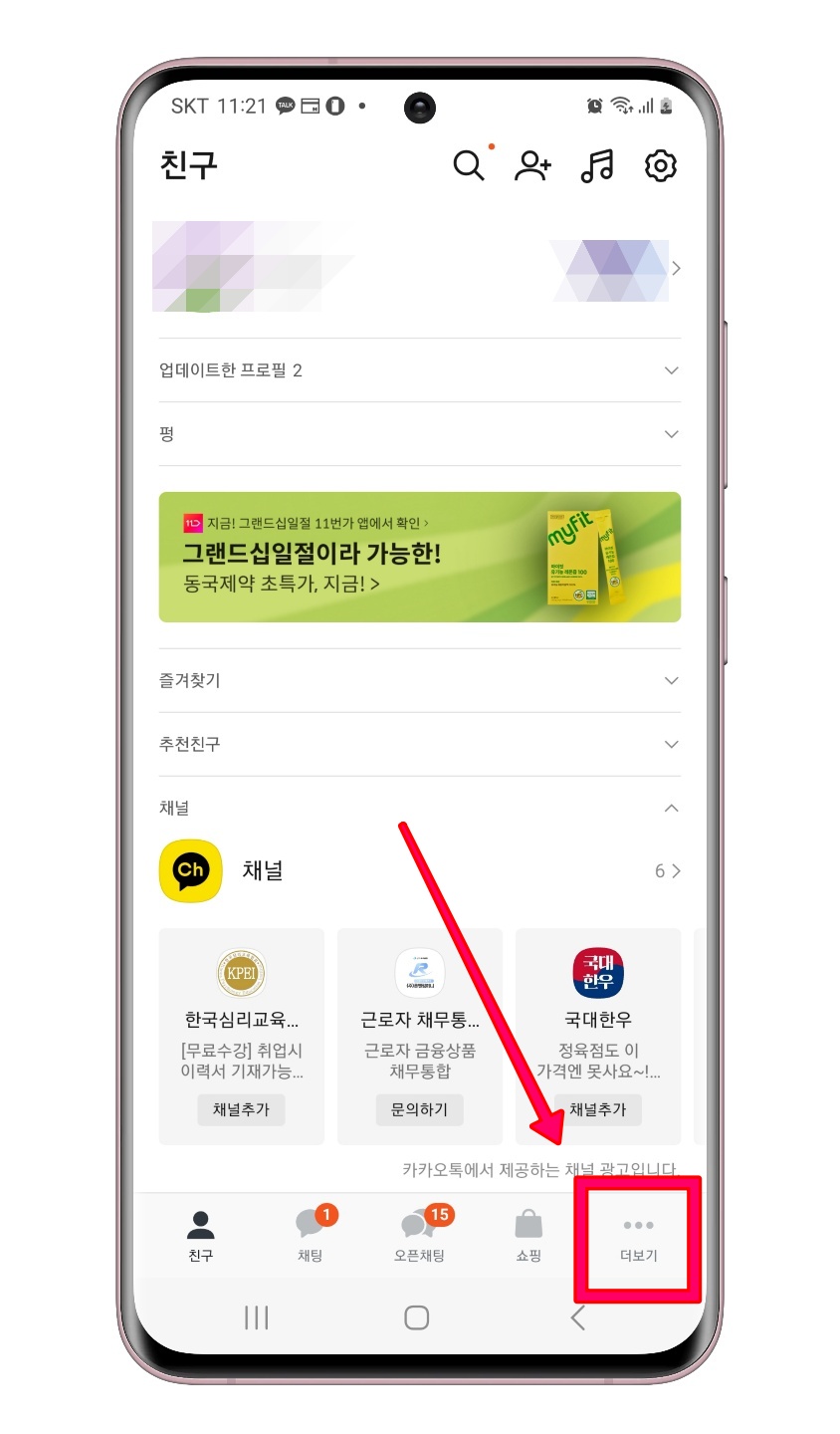STEP 1. 카카오톡 앱을 실행해 주세요. 그리고 우측하단 ··· 더보기 메뉴를 선택해 주세요.