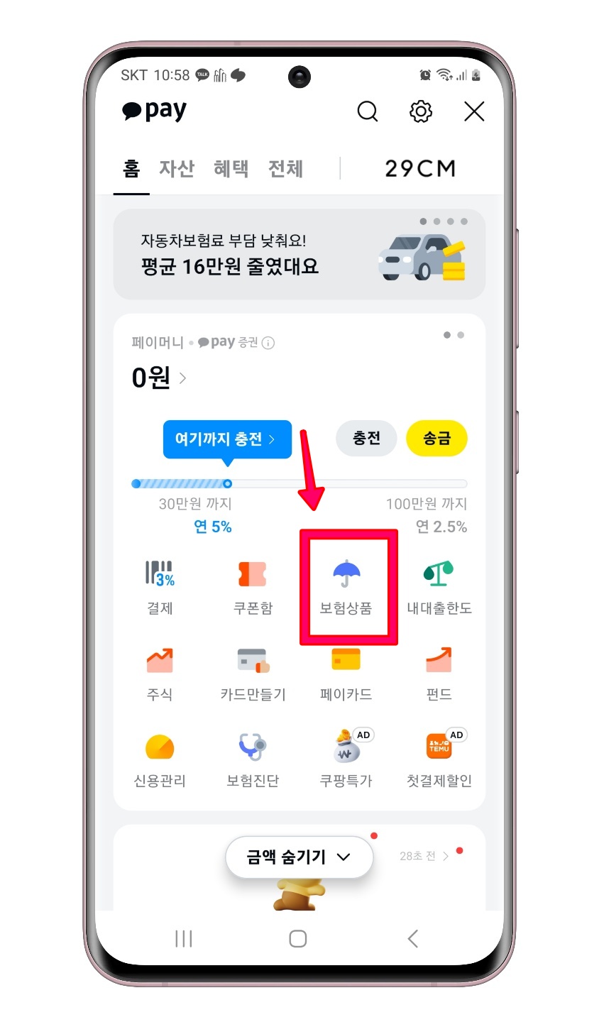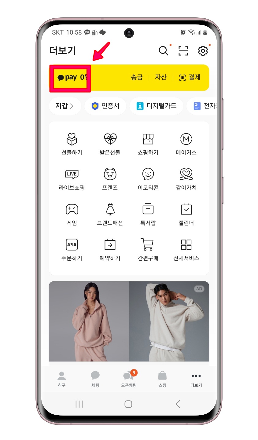 STEP 2. 더보기 메뉴를 선택하면 좌측 상단에 pay 가 나옵니다. 이 pay 글자를 선택해주세요.