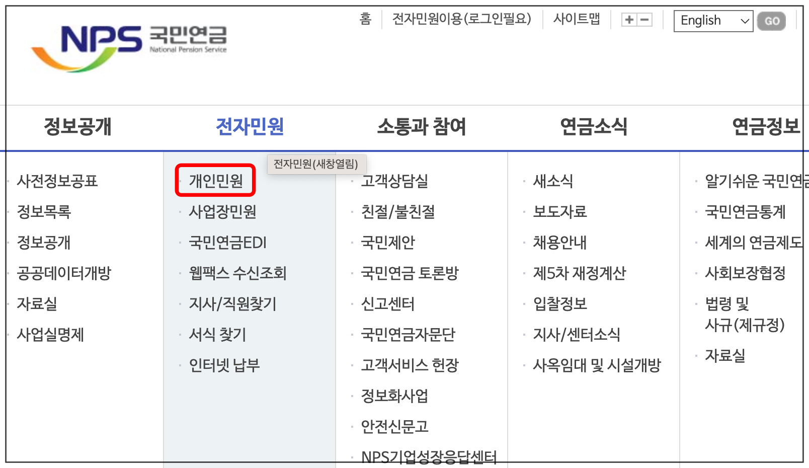 국민연금공단 홈페이지에 접속해 인증서 로그인을 해주세요. 그리고 상단 메뉴 중 [전자민원] - [ 개인민원 ] - [ 연금/일시금 청구]를 선택하여 신청하면 됩니다.