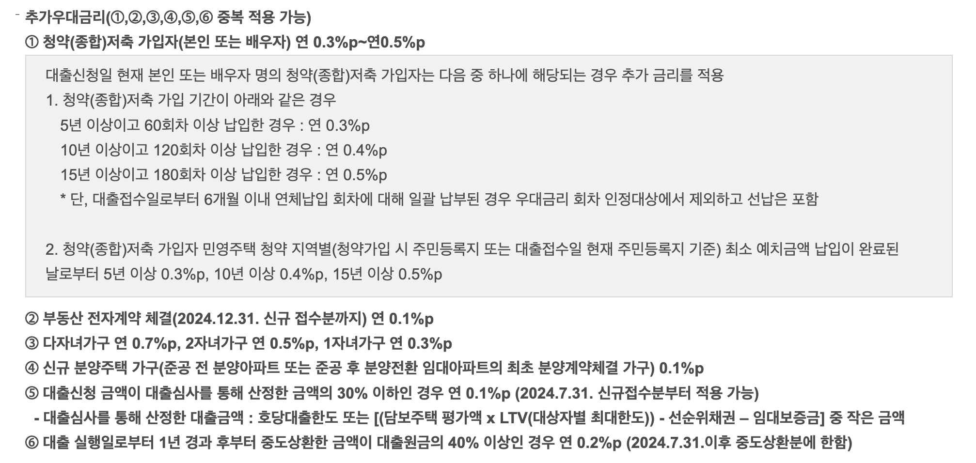 청약저축 가입기간이 15년 이상 및 180회차 이상 납부, 전자계약, 2자녀 가구 여부에 따라 우대금리가 적용됩니다. 우대금리는 대출금리에 차감되어 적용됩니다.