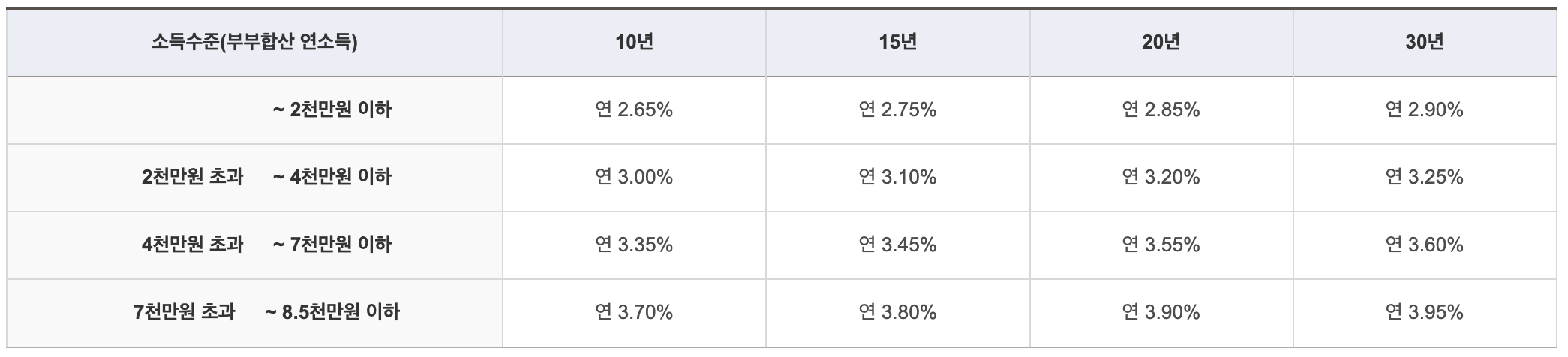 부부합산 연소득 6천만원 이하, 순자산가액 4.69억원 이하 무주택 세대주라면 대출대상에 해당됩니다. 생애최초 주택구입자의 경우, 2자녀이상 가구는 연소득 7천만원, 신혼가구는 연소득 8.5천만원 이하로 적용됩니다.