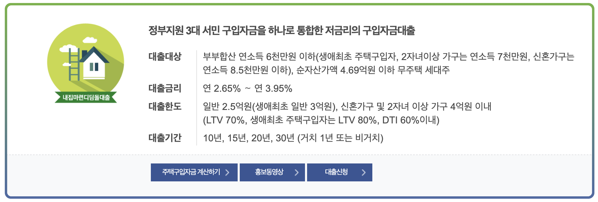 내집마련 디딤돌대출은 정부지원 3대 서민 구입자금을 하나로 통합한 저금리의 구입자금대출 상품입니다.
