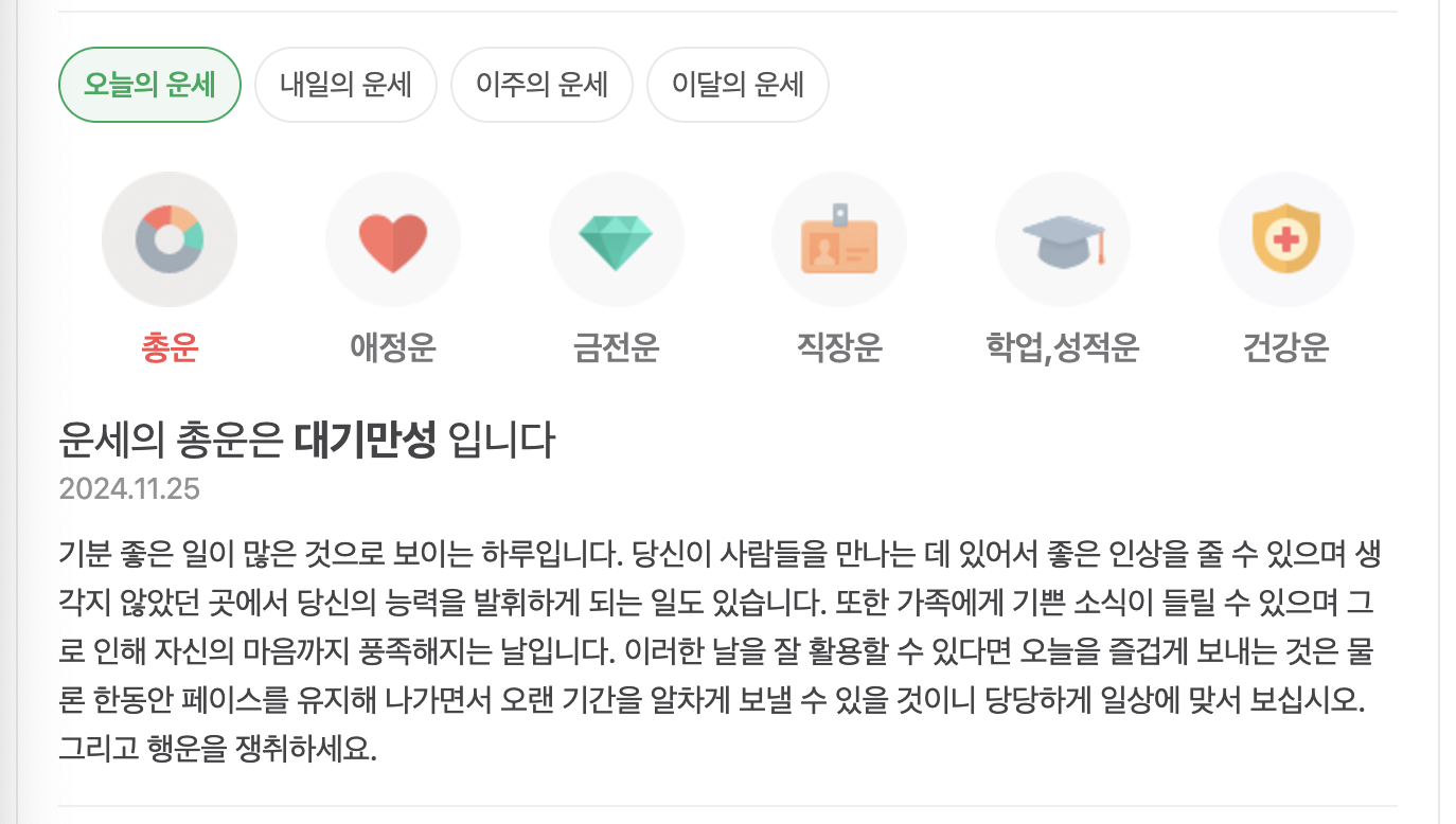 총운 / 애정운 / 금전운 / 직장운 / 학업,성적운 / 건강운 과 같이 세분화된 운세도 볼 수 있으니 가볍게 참고하시기 바랍니다.