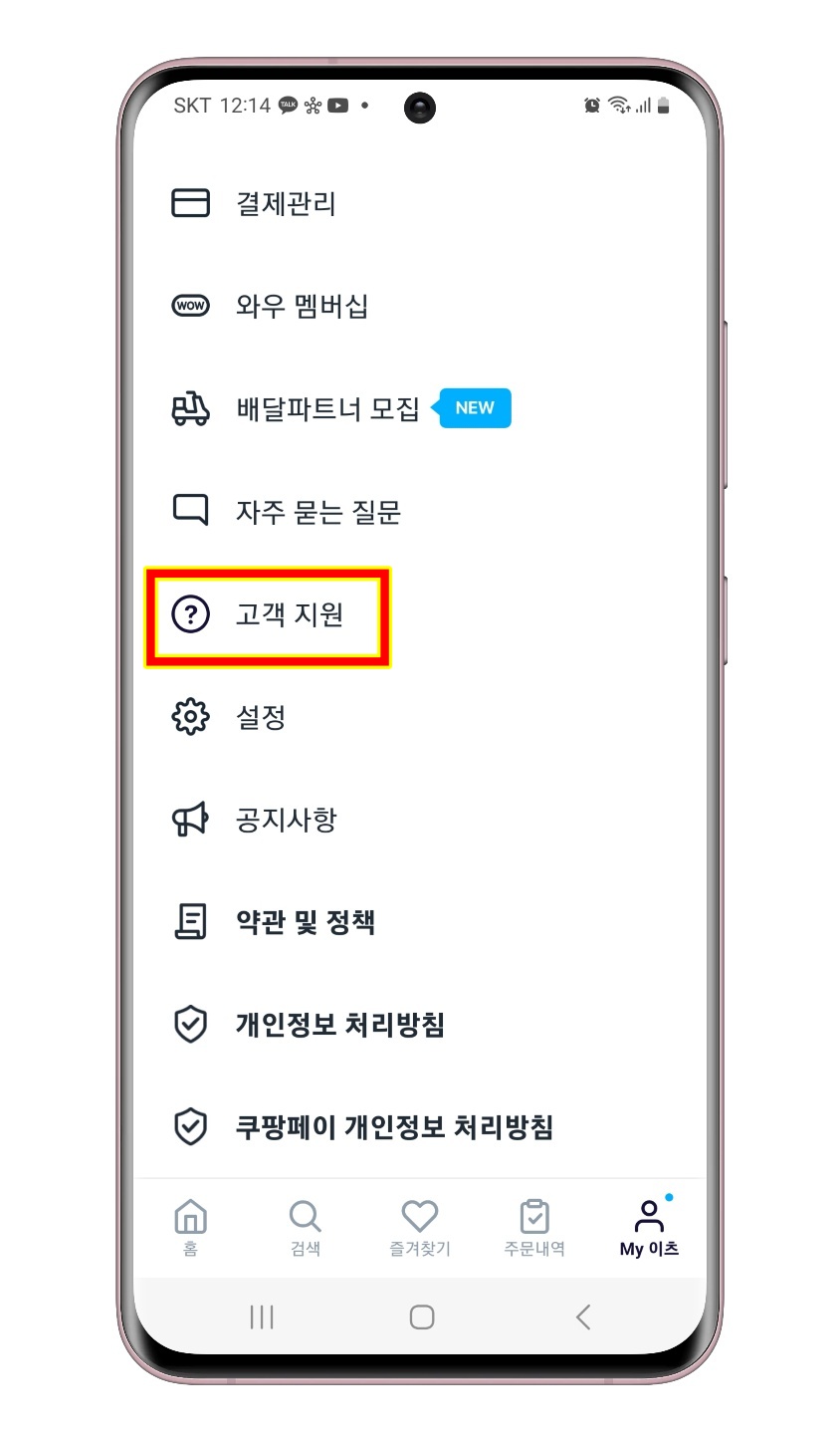 위의 사진은 쿠팡이츠 앱을 통하여 주문하실 때 볼 수 있는 화면입니다. 우측 하단을 보면 [My이츠] 메뉴가 있고, 이를 선택하면 다음 화면에 [고객 지원] 메뉴가 있습니다. (많은 메뉴가 나오는데 내리다보면 중간 쯤 고객지원을 볼 수 있습니다.)