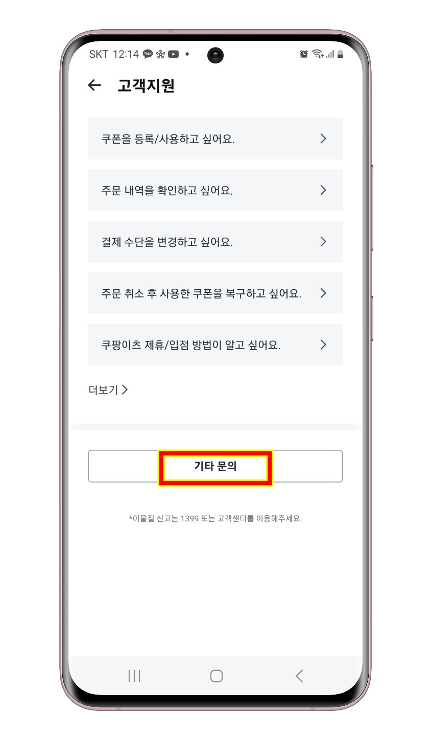 [고객지원]에 들어가면 자주 묻는 질문/답변을 볼 수 있습니다. 더보기>를 선택하면 더 많은 질문과 답변이 있습니다. 하단을 보시면 [기타 문의]가 있습니다. 이 메뉴를 선택하시면 아래와 같이 세 가지 문의 방법을 볼 수 있습니다.