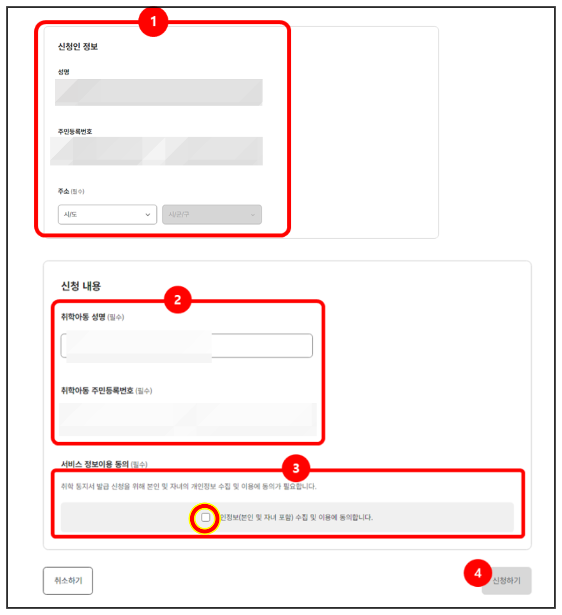 취학 대상 아동이 2명 이상이라면 아동 개개인의 정보로 각각 신청해주셔야 합니다.
