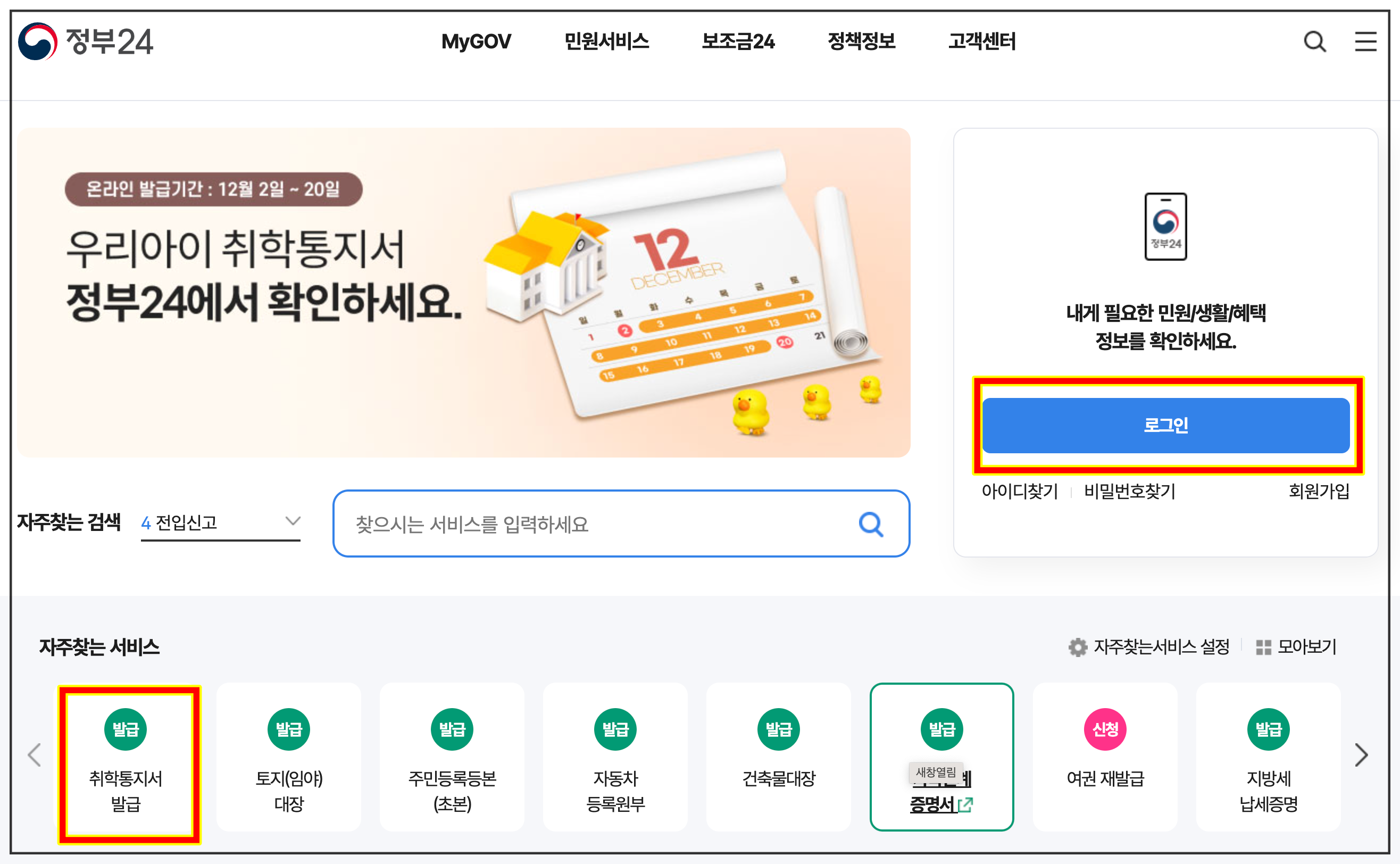 발급 STEP2. 취학통지서 서비스 검색