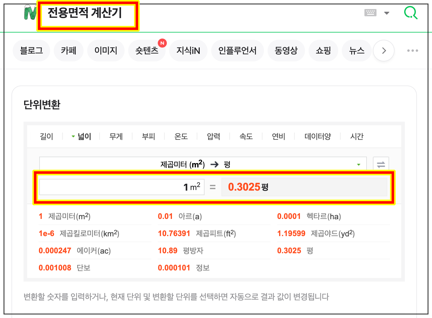 위 사진과 같이 검색창에 [전용면적 계산기] 혹은 [평수 계산기]를 입력하시면 빠르고 편리하게 단위변환이 이뤄집니다.