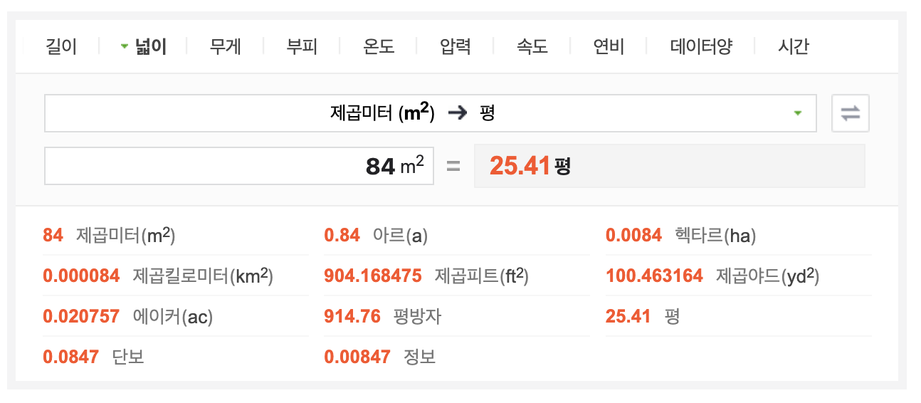 국민평수인 84㎡는 25.41평으로 계산되는 것을 볼 수 있습니다. (1평=3.3㎡)