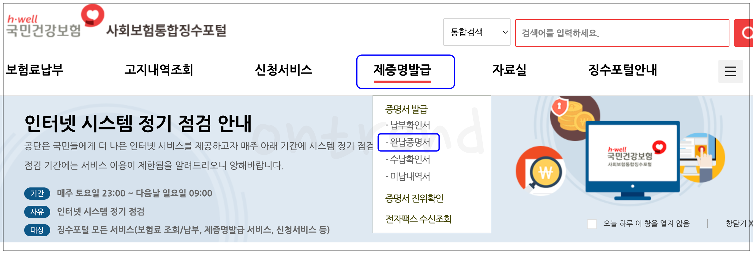 이 4대보험 완납증명서는 [국민건강보험공단] 홈페이지에서 발급이 가능합니다. 단, 인증서가 필요하니 미리 준비하시기 바랍니다.