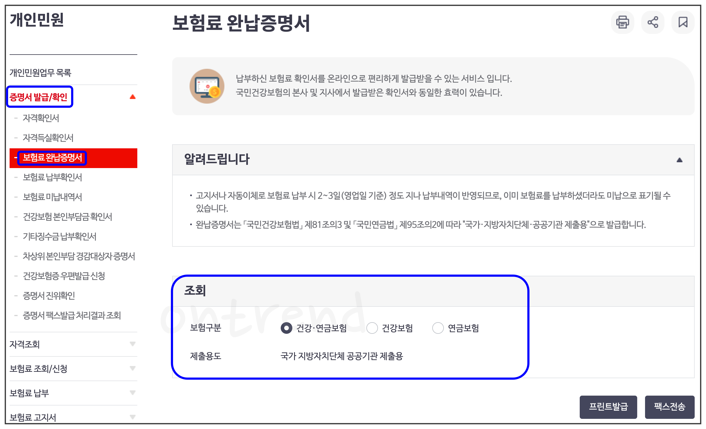 건강. 연금보험 / 건강보험 / 연금보험 중 원하는 유형을 선택할 수 있으며 선택 후, 프린트발급 또는 팩스전송을 선택하여 발급받으면 됩니다.