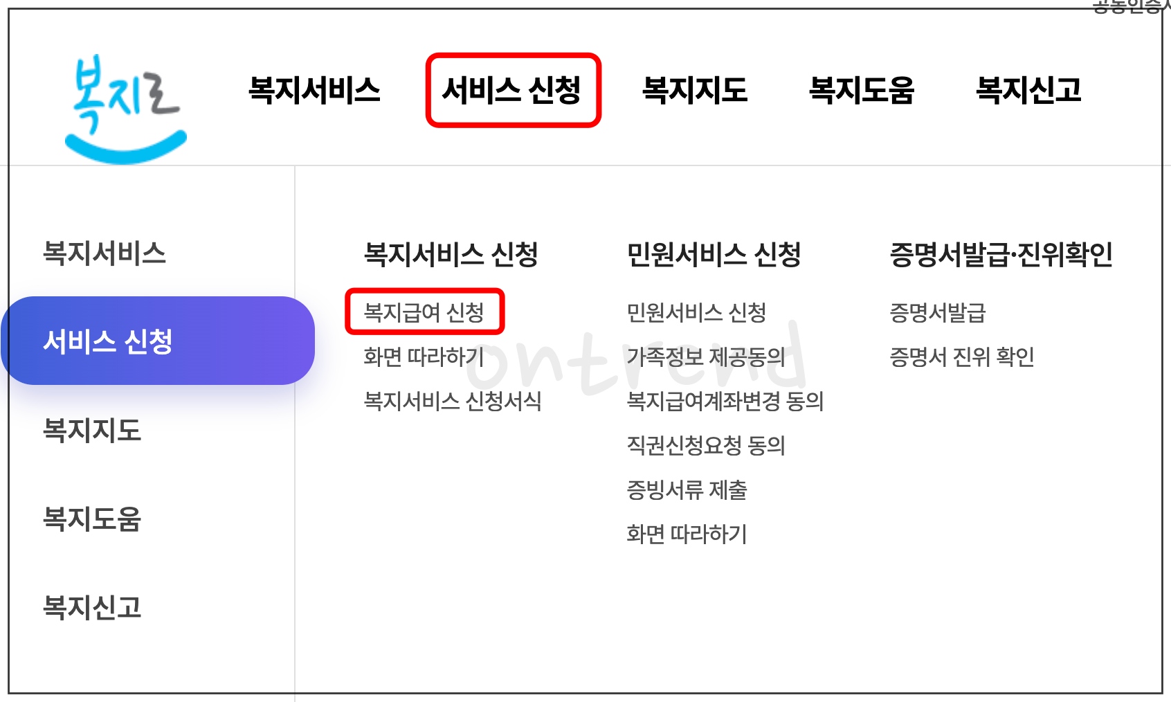 step2. [서비스 신청] - [복지서비스 신청] - [ 복지급여 신청] 메뉴로 이동해주세요.