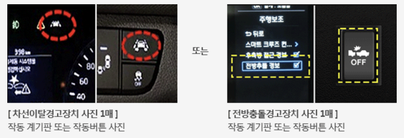 가입 시 [2.자동차 정보] 단계에서 차선이탈경고장치 또는 전방충돌방지장치 장착 여부를 선택 - 첨단안전장치의 장착 연도 및 구입금액을 입력 - [6.계약내용 확인]단계에서 자동 계기판 또는 작동버튼 사진을 등록하면 됩니다.