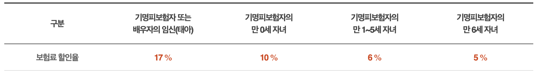 태아 또는 만 6세 이하 자녀가 있으시면 할인 받을 수 있는 특약입니다. 가장 어린 나이의 자녀를 기준으로 적용됩니다.