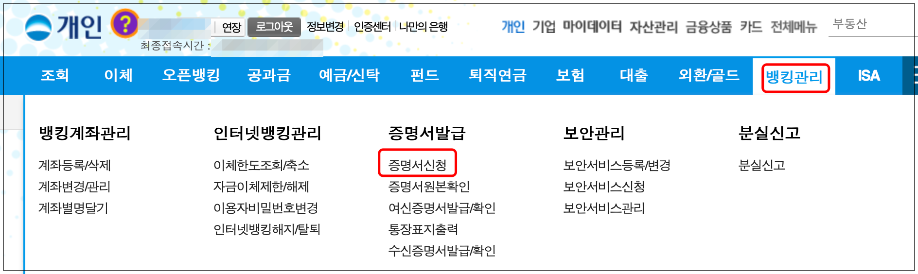 [로그인] > [ 뱅킹관리 ] 메뉴 선택 > [증명서발급 - 증명서신청] 메뉴 선택