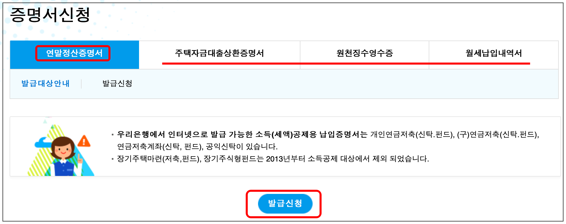 [연말정산증명서] 선택 후, 하단 [발급신청] 클릭하면 됩니다. 이 밖에도 주택자금대출상환증명서 / 원천징수영수증 / 월세납입내역서 발급도 가능합니다.