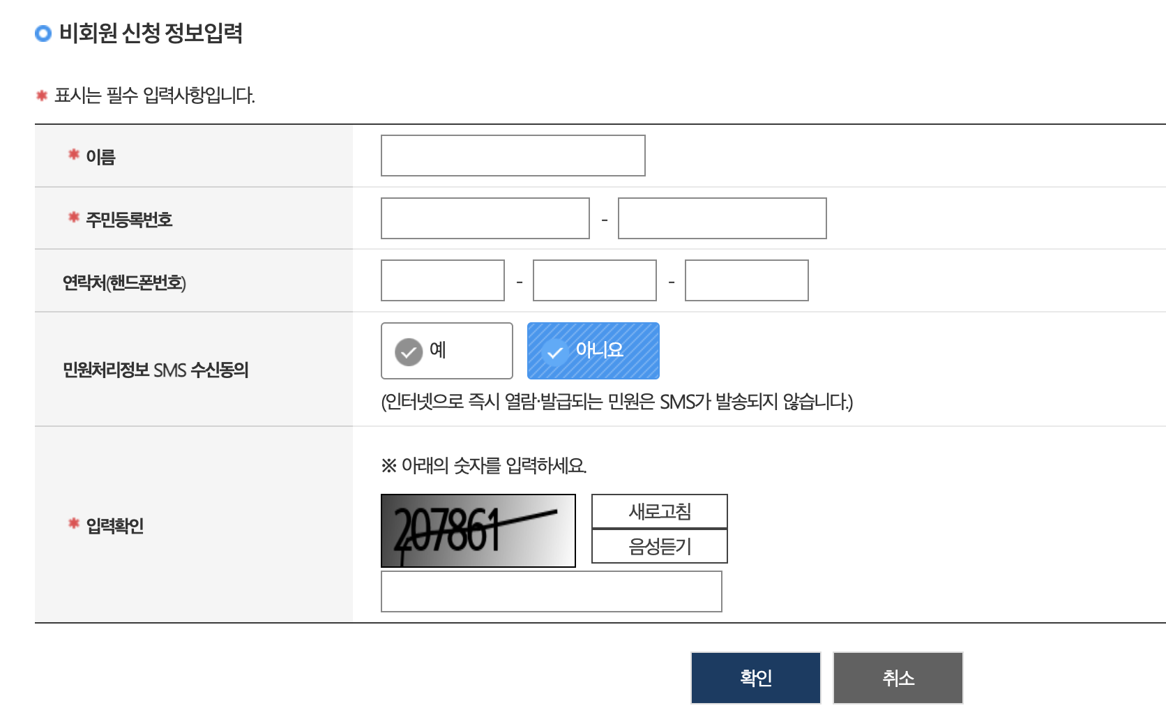4. 개인정보 수집 이용동의에 체크하고, 신청자 개인정보를 입력합니다. (이름/주민등록번호 필수입력)