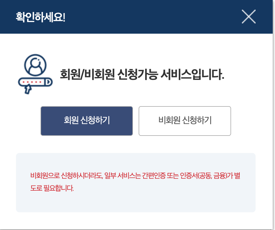 비회원으로 신청하기를 누르더라도 일부 서비스는 간편인증 / 인증서(공동,금융)가 별도로 필요합니다.