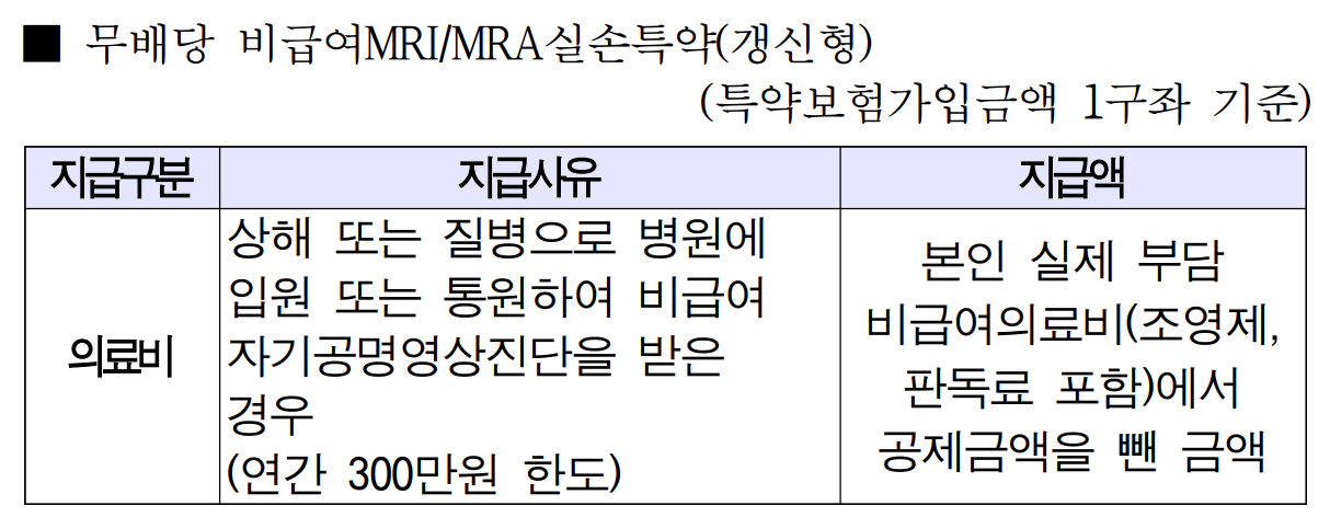 상해 또는 질병으로인해 병원에 입원 또는 통원하여 비급여 자기공명영상진단을 받은 경우 연간 300만원 한도로 보상됩니다. 공제금액은 1회당 2만원과 보상대상의료비의 30% 중 큰 금액을 공제합니다.
