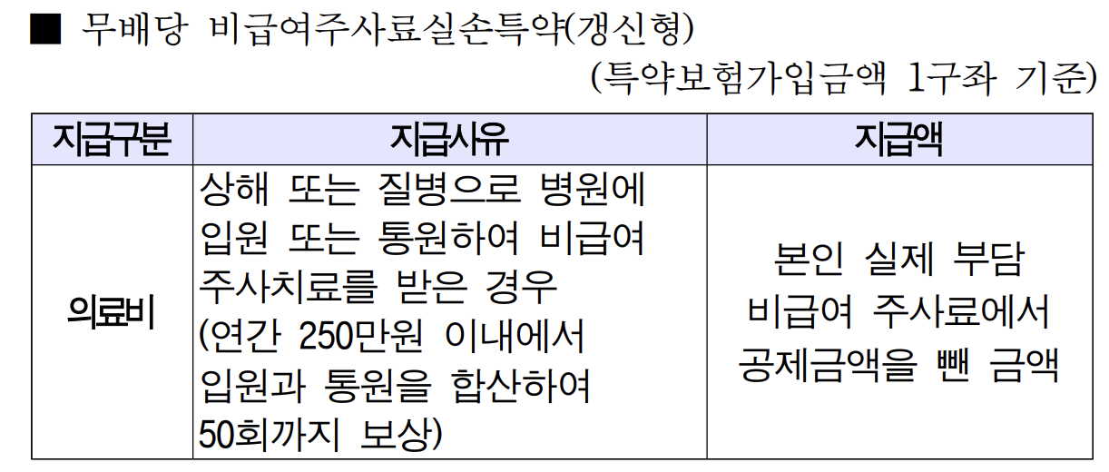상해 또는 질병으로인하여 입원 또는 통원 시 비급여 주사치료를 받은 경우, 연 250만원 이내에서 입원과 통원을 합산하여 50회까지 보상됩니다. 공제금액은 입원.통회 1회당 2만원과 보상대상의료비의 30% 중 큰 금액을 공제합니다.