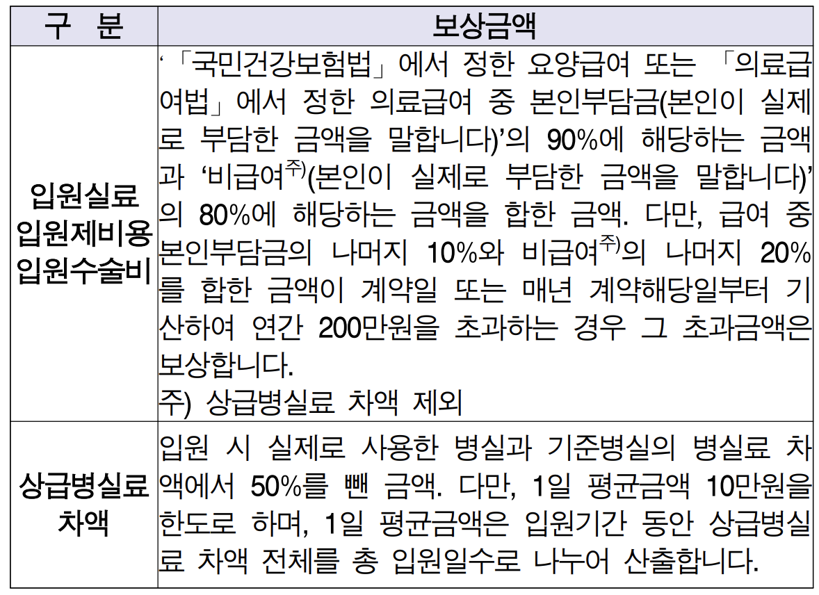 - 의원 : 1만원과 공제기준금액(보상대상의료비의 급여 10%에 해당하는 금액과 비급여 20%에 해당하는 금액을 합한 금액) 중 큰 금액