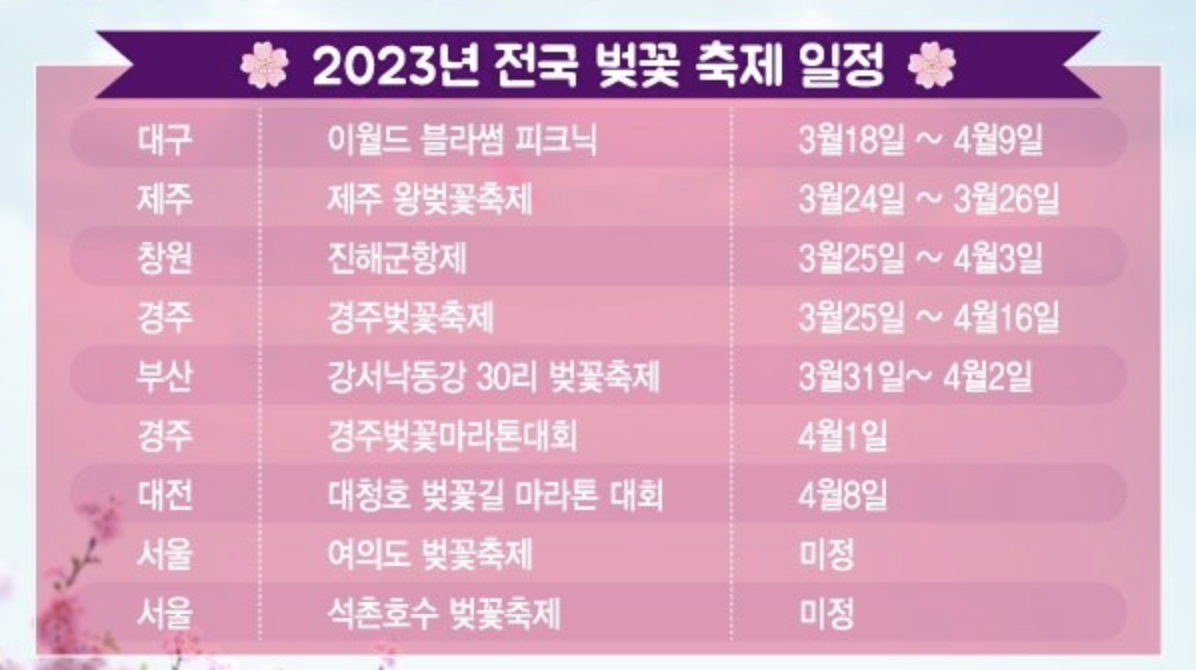 그동안 코로나19로 중단됐던 벚꽃축제도 정상 개최됩니다. 제주 왕벚꽃축제는 3월 24일 ~ 3월 26일, 진행군항제는 3월 25일 ~ 4월 3일에 축제가 예정되어 있습니다. 또한 서울 여의도 벚꽃축제, 석촌호수 벚꽃축제 또한 개최될 예정이나 아직 일정은 나오지 않았습니다.