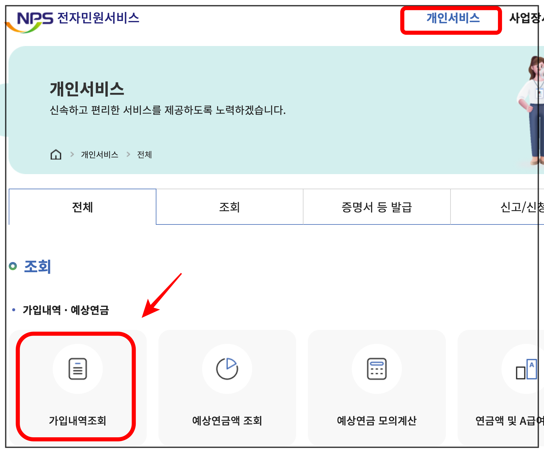 3. 로그인 후, 상단 [개인서비스] - [ 가입내역조회 ]를 선택해주세요.