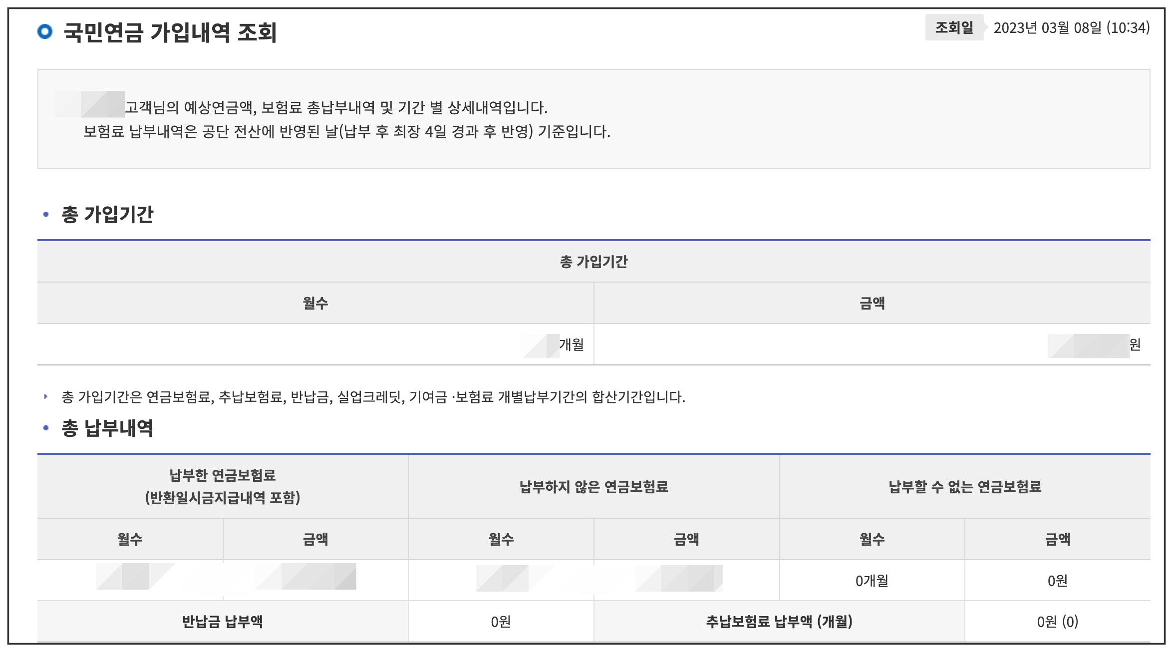 4. 아래와 같이 국민연금 가입내역을 조회할 수 있습니다. 총 가입기간, 총 금액 확인이 가능합니다.