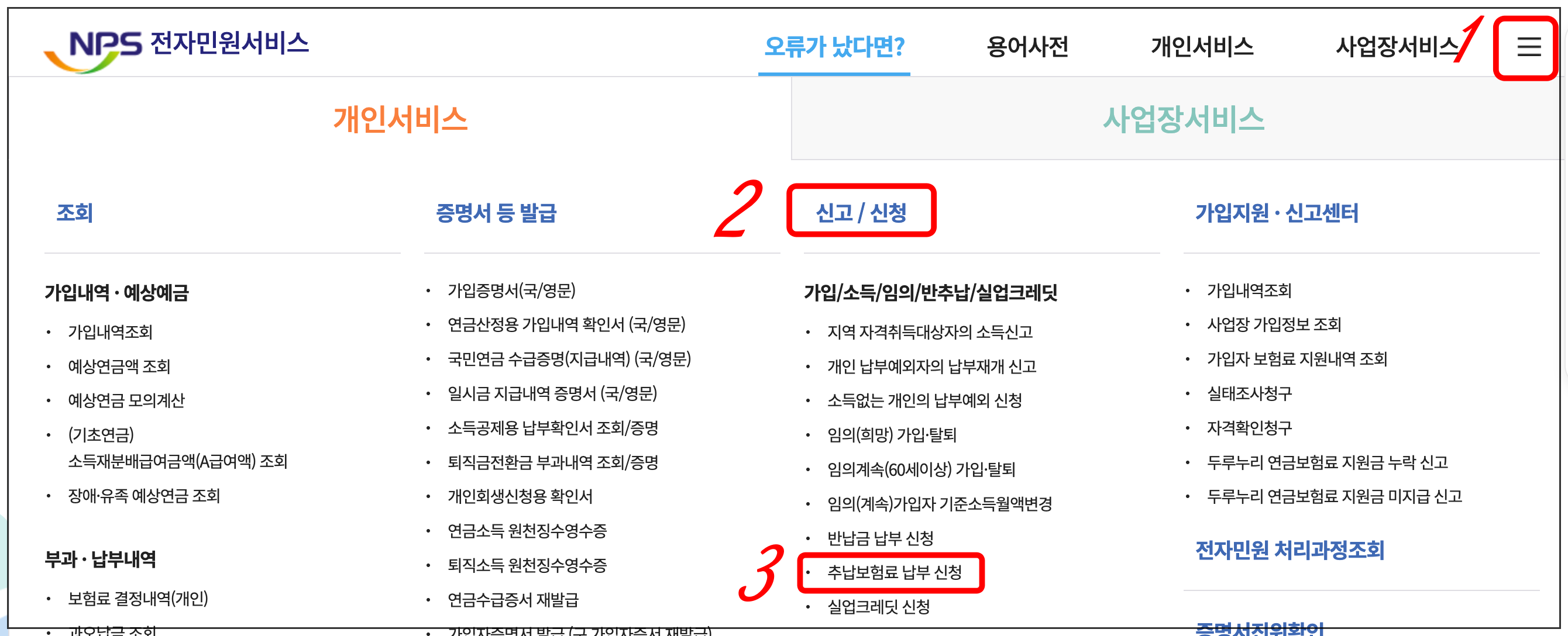 [국민연금공단] 홈페이지에서 ≡ 선택 > 신고/신청 > 추납보험료 신청 에서 신청이 가능합니다.