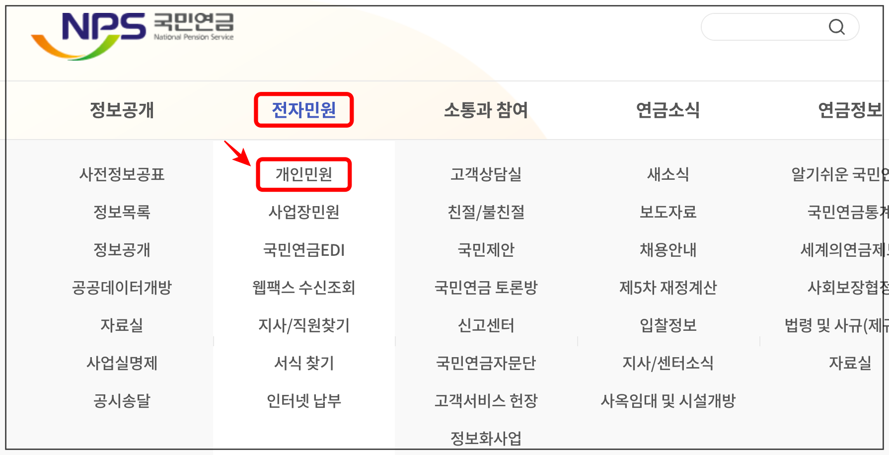 2. 국민연금공단 홈페이지에서 [전자민원]을 선택 후, 로그인을 진행해주세요.