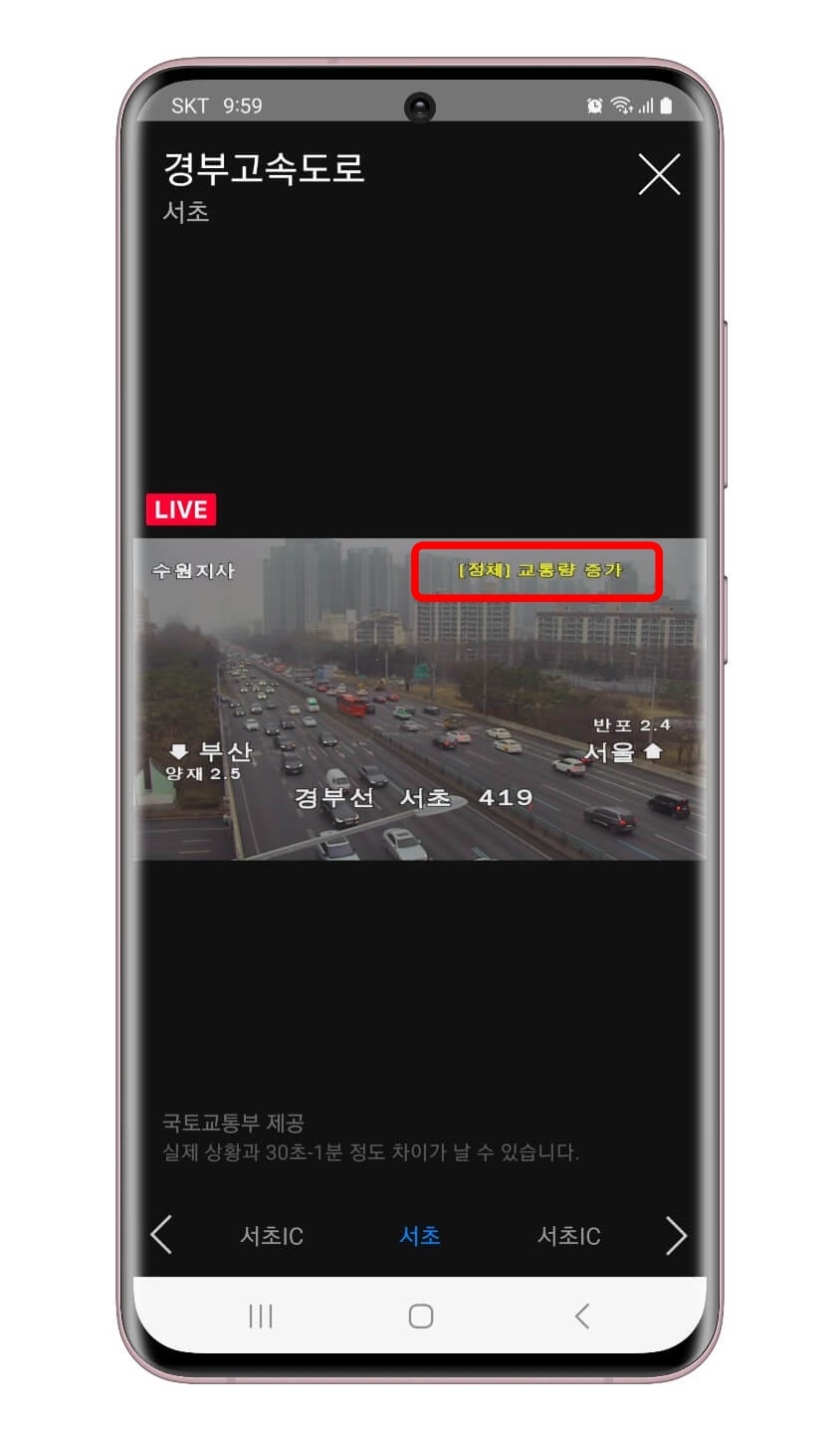 아래는 경부고속도로 서초IC의 CCTV 입니다. 이처럼 원하는 경로의 CCTV를 살펴본 후, 경로를 수정하거나 출발 시간을 조정하면 되겠습니다. 교통량이 증가하여 정체가 시작된 도로에서는 CCTV화면 우측 상단에 노란글씨로 표기되니 참고하시기 바랍니다.