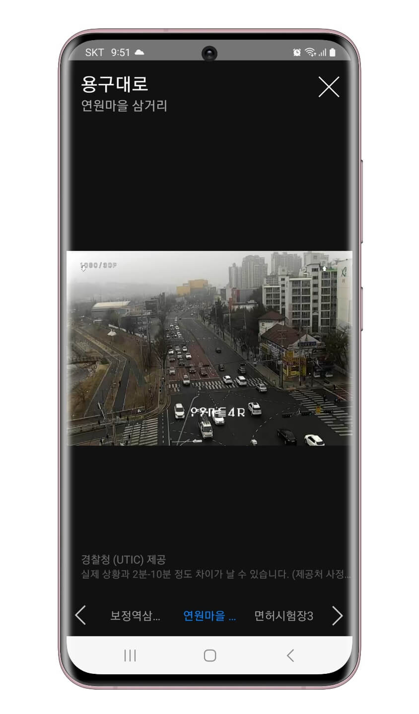 4. 아래와 같이 실시간 교통상황을 CCTV로 볼 수 있습니다. 화면 하단을 보면, 인접한 도로명이 나옵니다. 이 곳에서 도로명을 선택하면 그 위치의 CCTV로 화면이 바뀌게 됩니다.