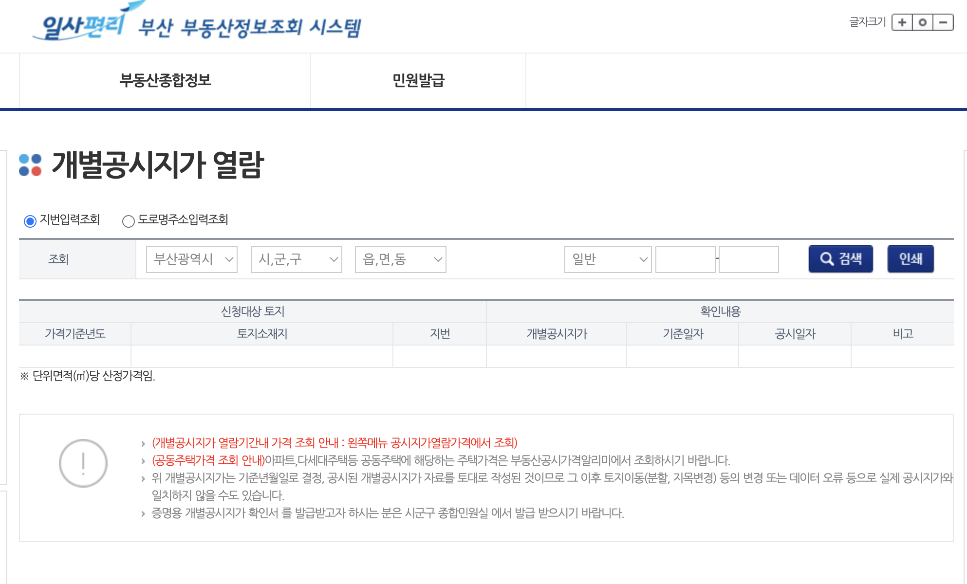 표준지공시지가는 부동산공시가격 알리미에서 확인이 가능합니다. 개별공시지가는 해당 시.군.구청 홈페이지에서 열람할 수 있습니다.