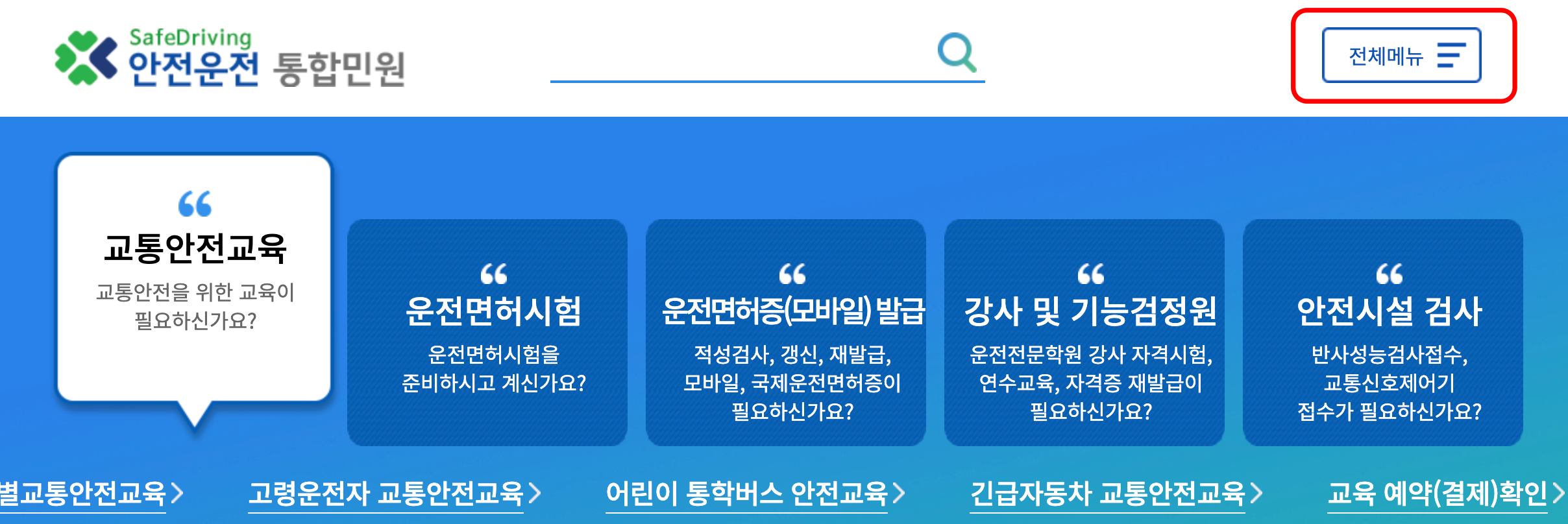 우선 [안전운전 통합민원] 홈페이지에 접속해 주세요. 접속 후, 오른쪽 상단을 보면 전체메뉴가 있습니다. 이 곳을 선택해주세요.